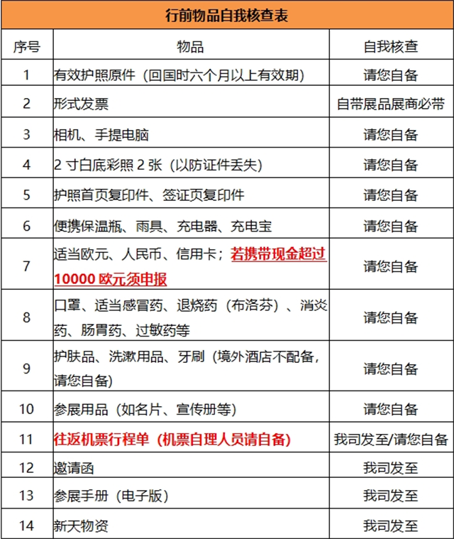 Ø 請您出行時(shí)攜帶好:護(hù)照原件、有效簽證頁、機(jī)票行程單、護(hù)照首頁復(fù)印件、證件相片兩張(備用),外幣(茲羅提元)、以及其它展會上用的東西。Ø 撤展注意:請您處理好展位上的樣品和垃圾,以免產(chǎn)生不必要的費(fèi)用!