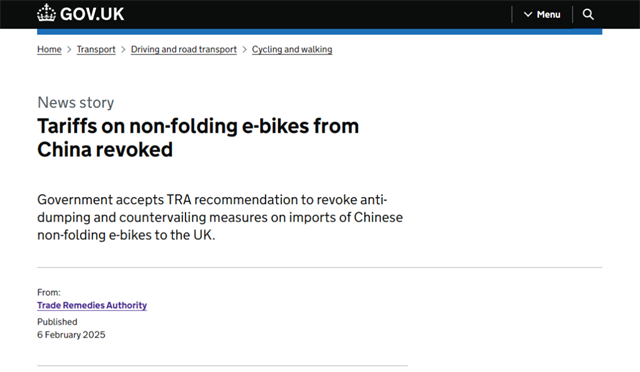 近日,英國經濟部根據貿易救濟署(TRA)的建議,取消了對從中國進口的非折疊電動自行車現行的反傾銷和反補貼措施。這一取消措施已于上周五(2月7日)生效。